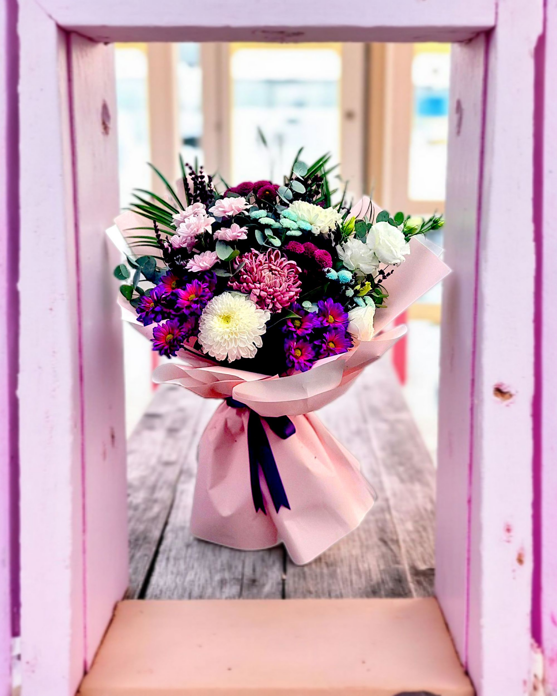 Bu buket, pembe ve morun romantizmini, beyazın saf ışıltısıyla birleştirerek hem sade hem etkileyici bir görünüm sunar.