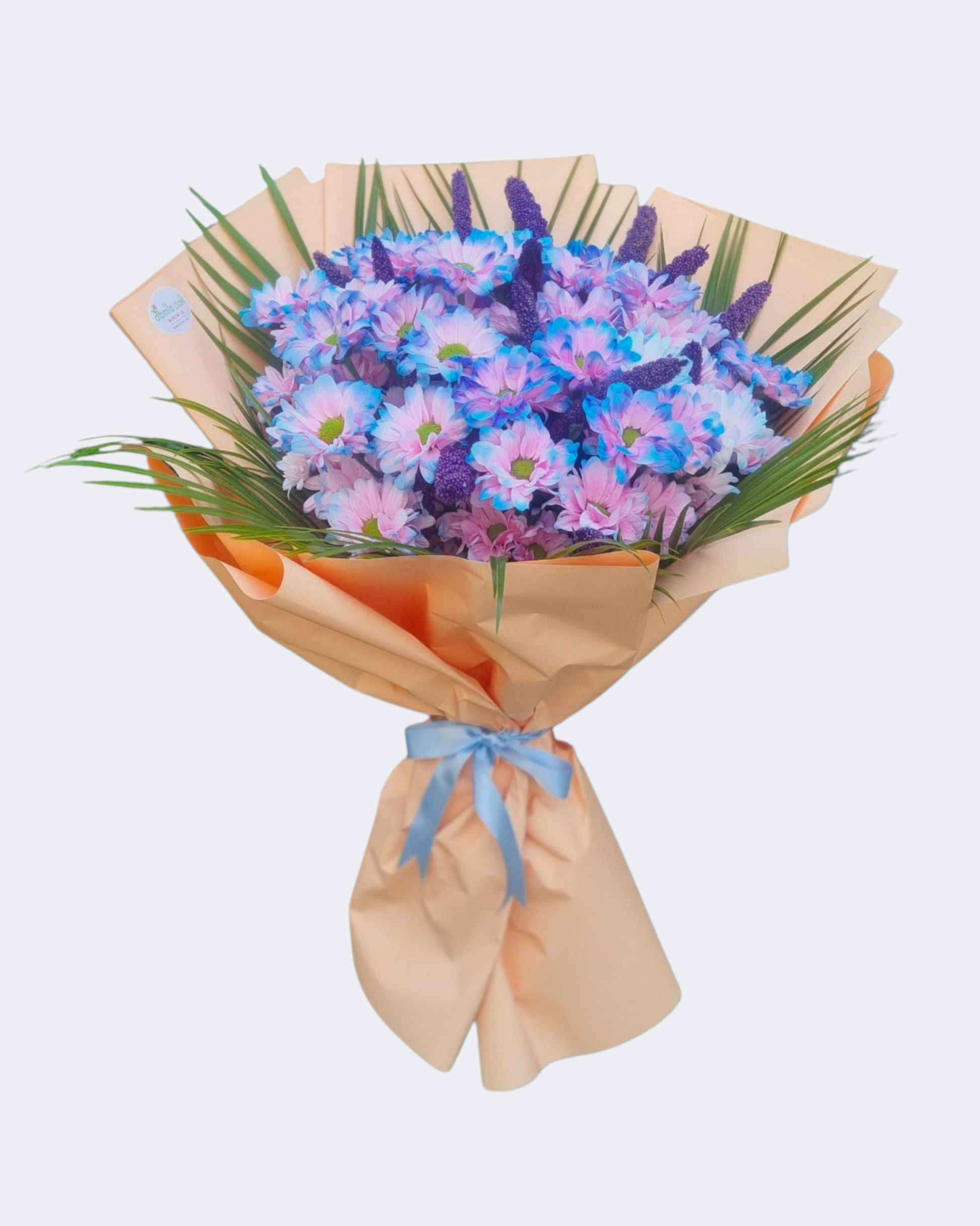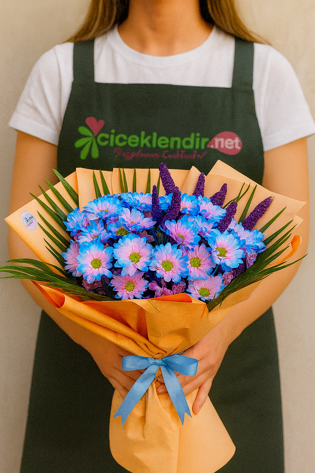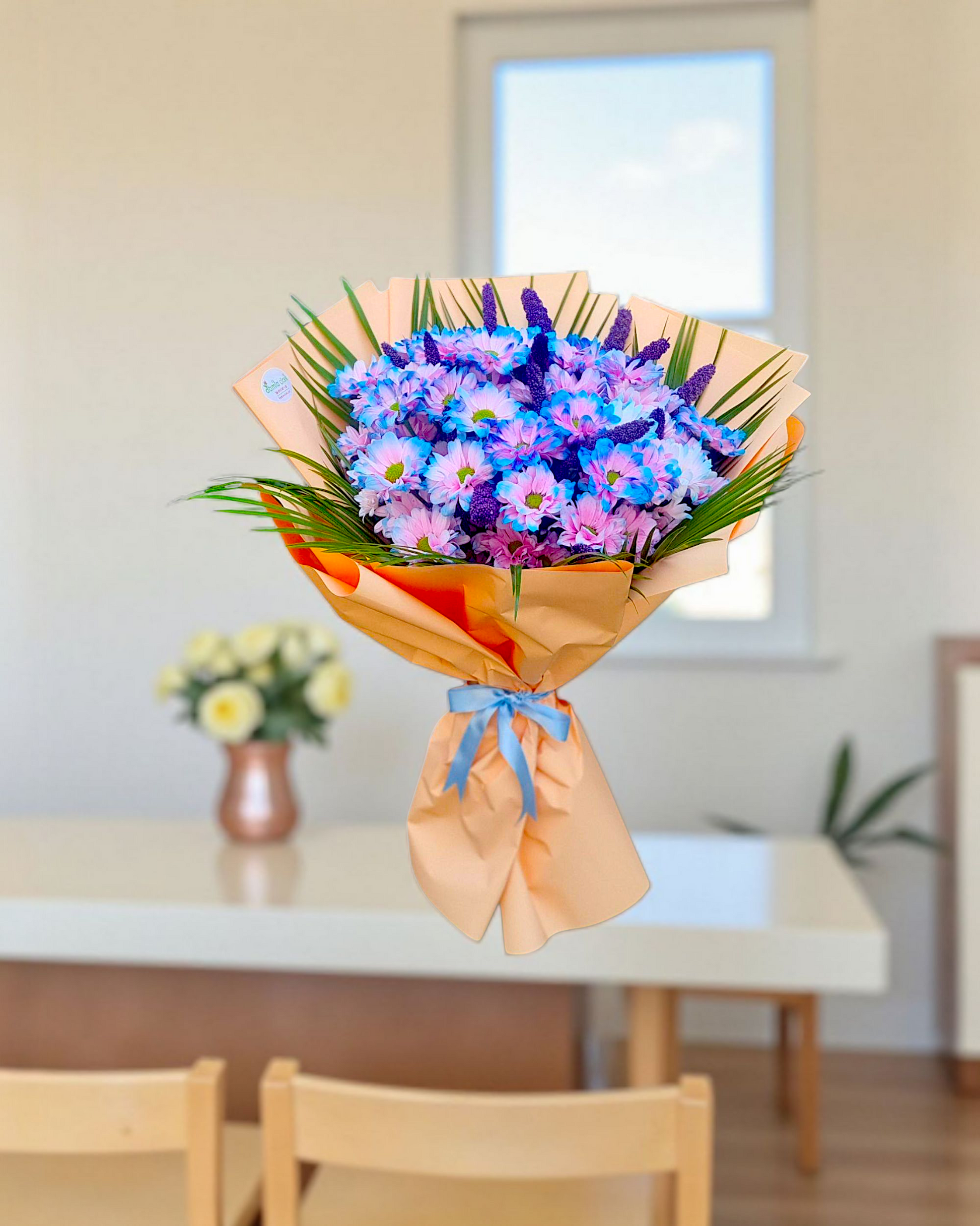Mavi, pembe ve mor tonlardaki çiçeklerin ahengi; tazeliği, gençliği ve pozitif enerjiyi simgeler.