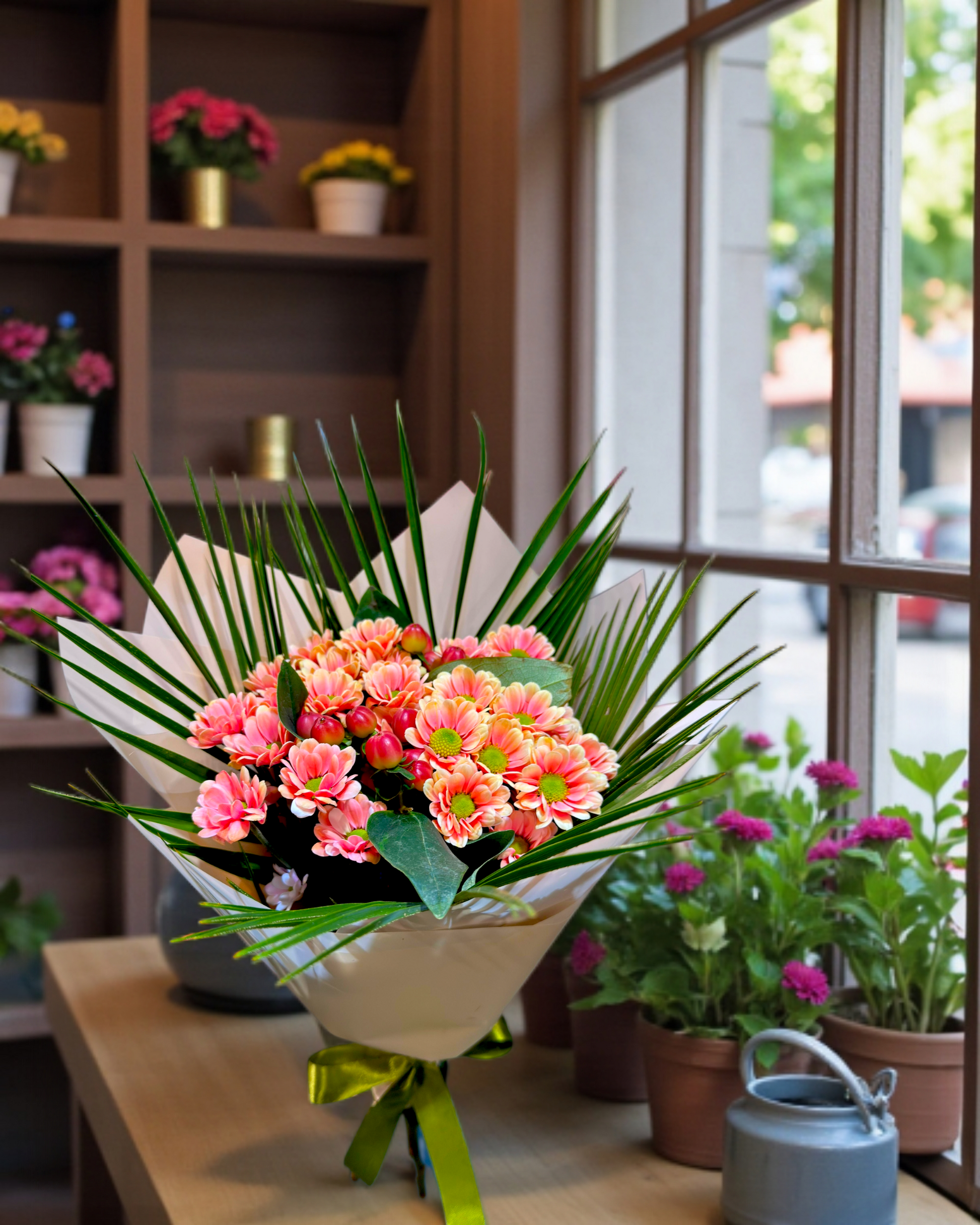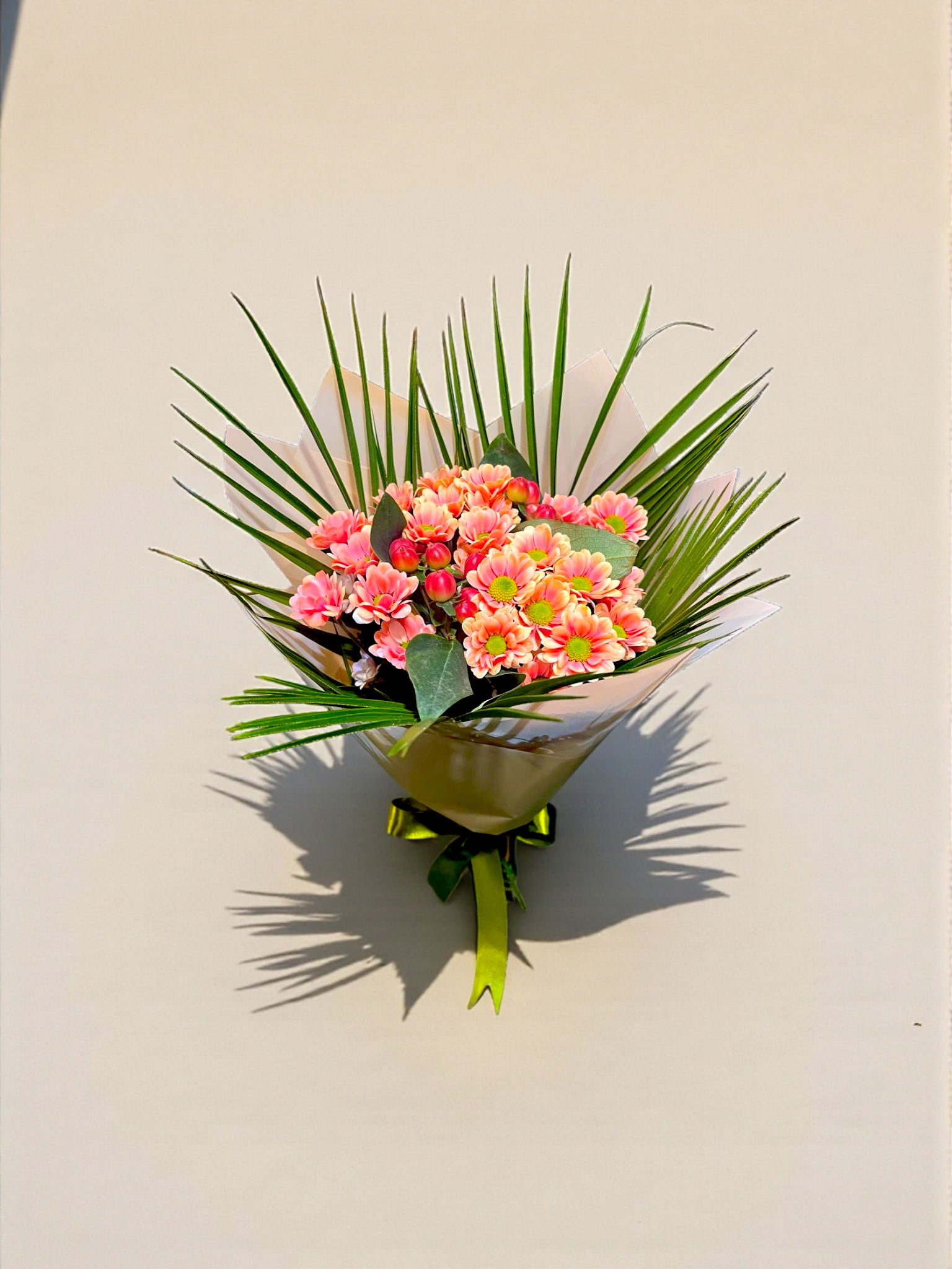 Canlı mercan tonlarındaki papatyalar, enerjisi yüksek ve neşeli bir dokunuşla bir araya gelerek zarif bir bukete dönüşüyor. Coral Daisy Charm, sıcak renklerin taze yeşil dokularla buluştuğu modern ve göz alıcı bir tasarım sunar. Sevgiyi, mutluluğu ve içtenliği en doğal haliyle ifade eden bu özel buket; doğum günü, teşekkür, yeni iş, geçmiş olsun gibi tüm özel anları anlamlandırmak için ideal bir seçenektir.