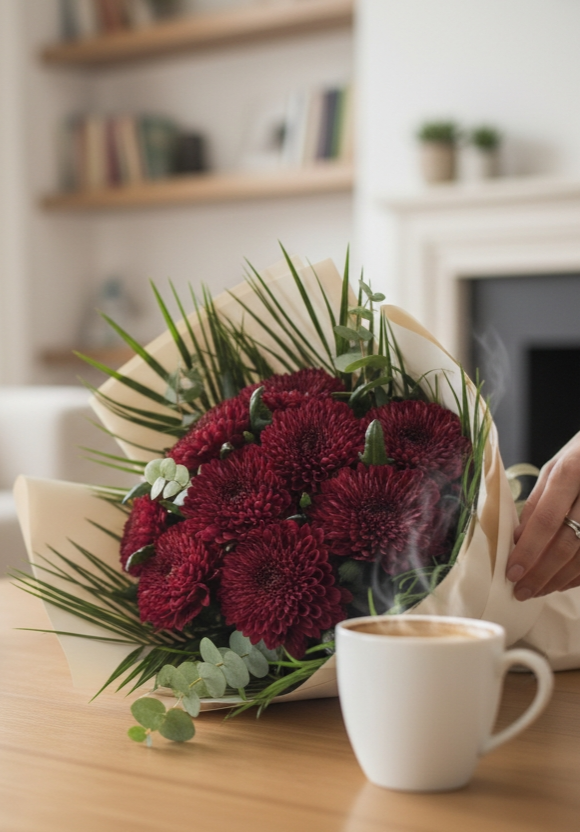 Crimson Passion Bouquet, derin bordo krizantemlerin güçlü enerjisini modern bir tasarımla bir araya getirir. Aşkı, tutkuyu ve kararlılığı simgeleyen bu özel buket; sade ama etkileyici görünümüyle özel anlara anlam katar.