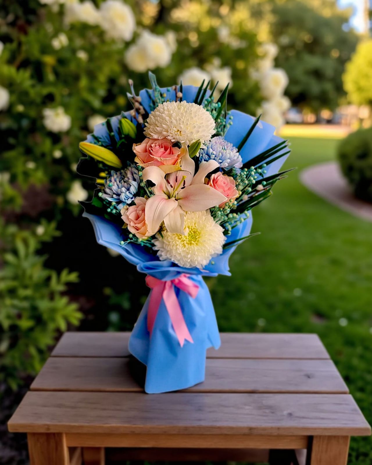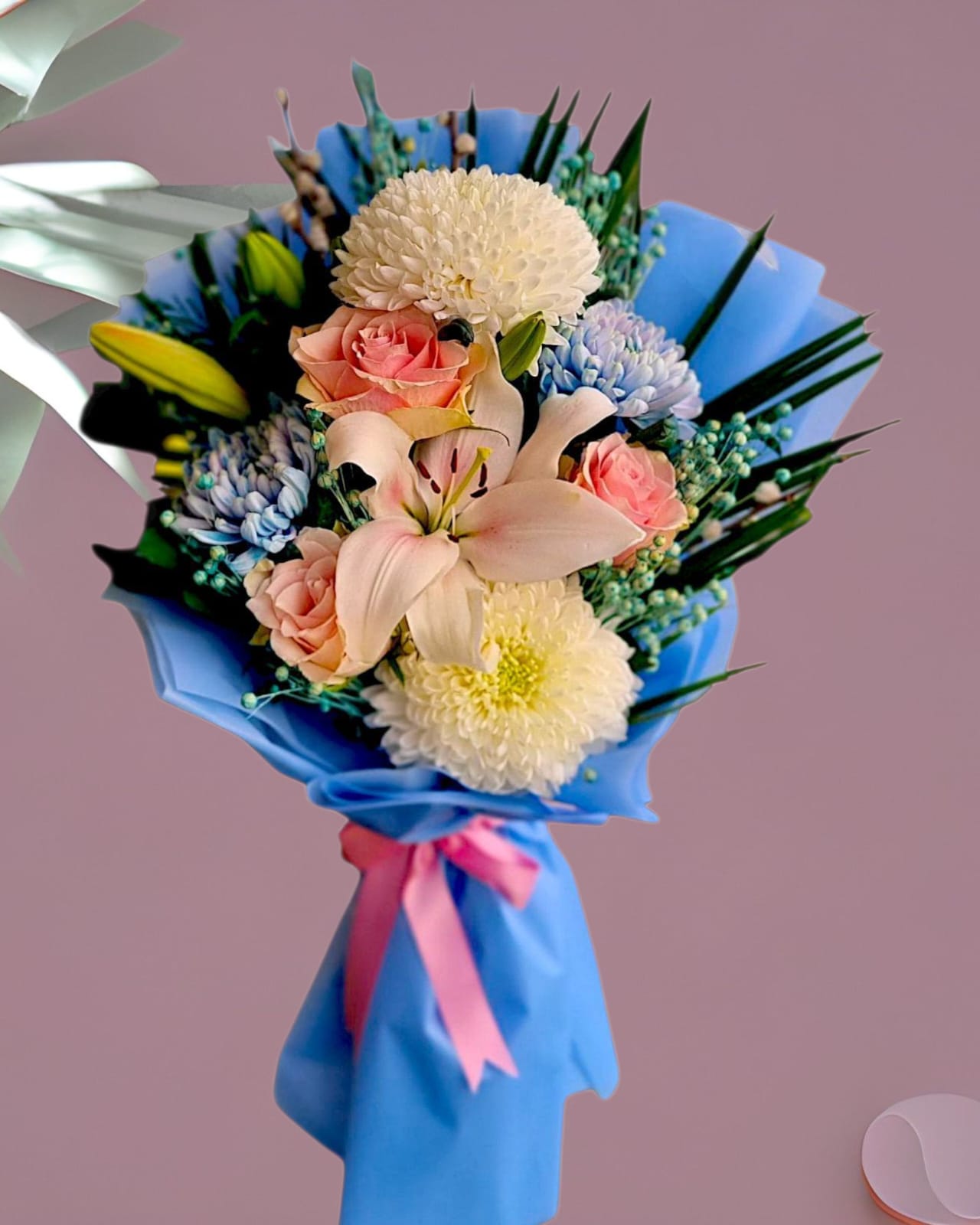 Pastel tonlardaki şebboy, lilyum ve şampanya güllerinin nazik geçişleri; mavi ambalajın dinginliğiyle buluşarak büyüleyici bir uyum yaratır.
