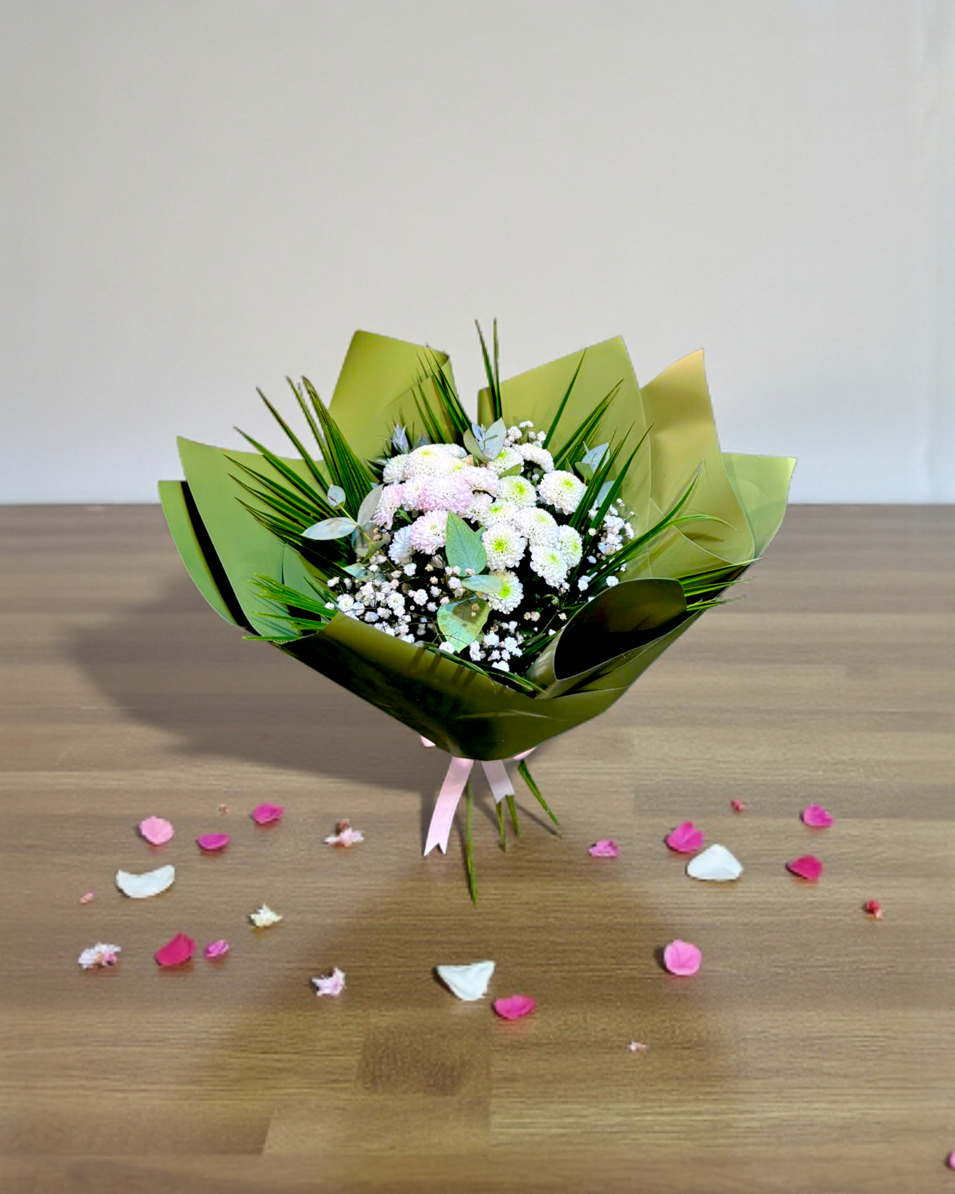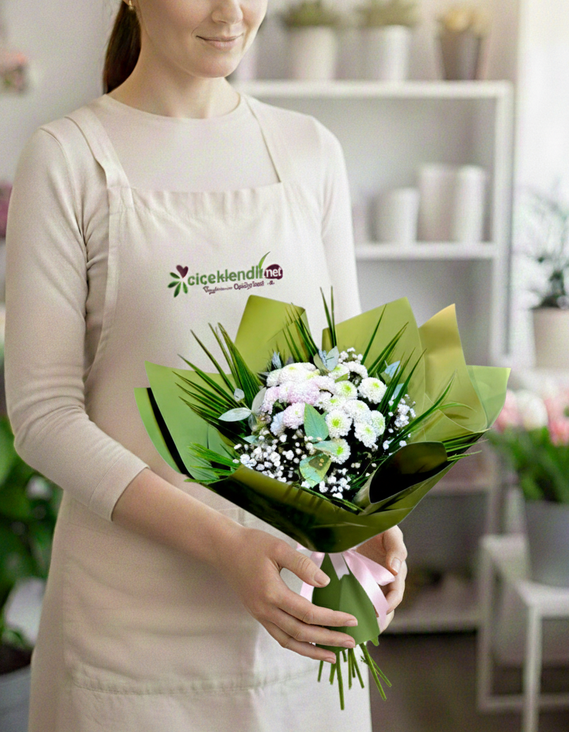 Kasımpatıların dolgun formu, gipsoylanın narin taneleri ve yeşil yaprakların canlı dokusu ile bir araya gelerek göz yormayan, iç açan bir görünüm sunar. Özel günlerde şık bir jest, ev ziyaretlerinde zarif bir hediye veya sevdiklerinize “iyi ki varsın” demenin en sade ama en etkileyici yolu…